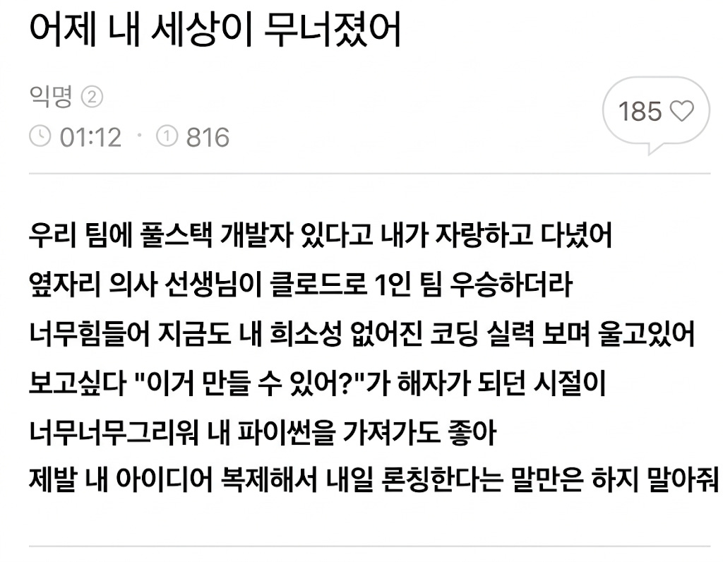 “빌드 말고 네트워킹이 핵심이다”라고요? 맞습니다. 하지만 그건 밋업이지 해커톤이 아닙니다. 함께 힘들게 밤새고 고생하면 만드는 과정에서 생기는 전우애와 유대감이 해커톤 네트워킹의 본질이었는데, 만드는 과정 자체가 너무 쉬워져버리면 그 유대감도 얕아집니다.