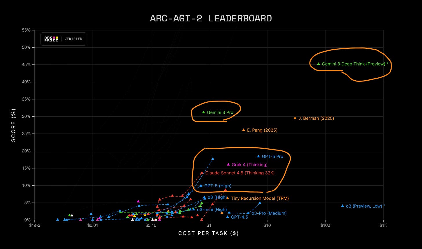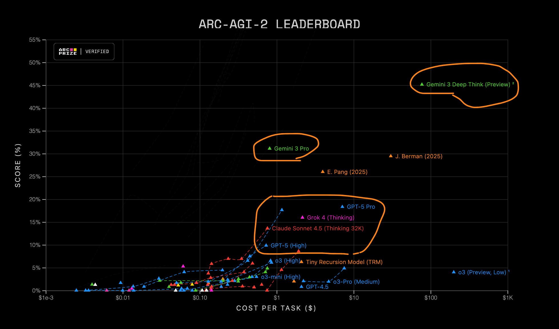 x축은 비용, y축은 성능으로 가장 오른쪽 위에 있는 아직 공개되지 않은 Gemini Deep Think가 OpenAI o3 다음으로 가장 비싼 가격이지만 다른 모델들에 대비해 비교도 안될만큼 미쳐버린(positive) 성능을 보여줌.