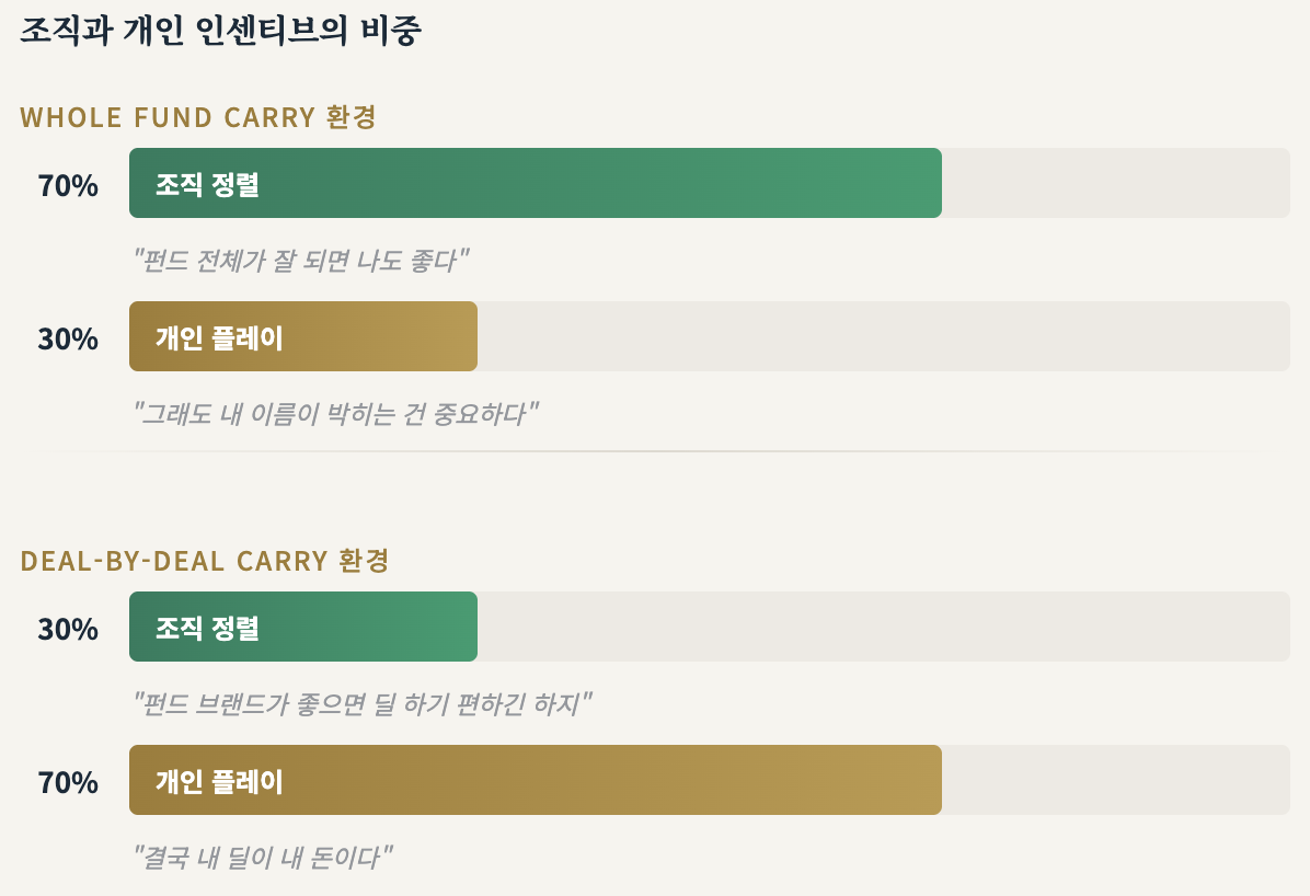 Deal-by-deal carry → 내 딜 최적화, 내 딜만 내 이익, 내부 경쟁 인센티브