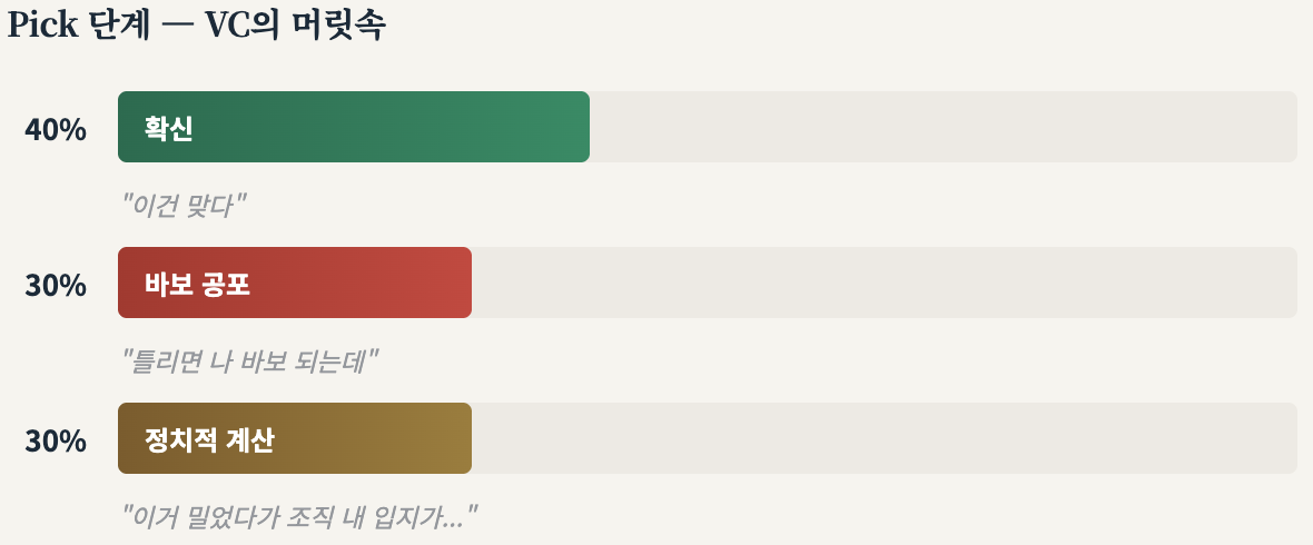 내 딜이 통과하려면 다른 사람의 딜보다 매력적이어야 하니까, 심사역 A가 밀고 있는 딜을 심사역 B가 적극적으로 디스할 인센티브가 구조적으로 존재합니다. 같은 편이어야 할 사람들이 서로 경쟁하는 구조인거죠.
