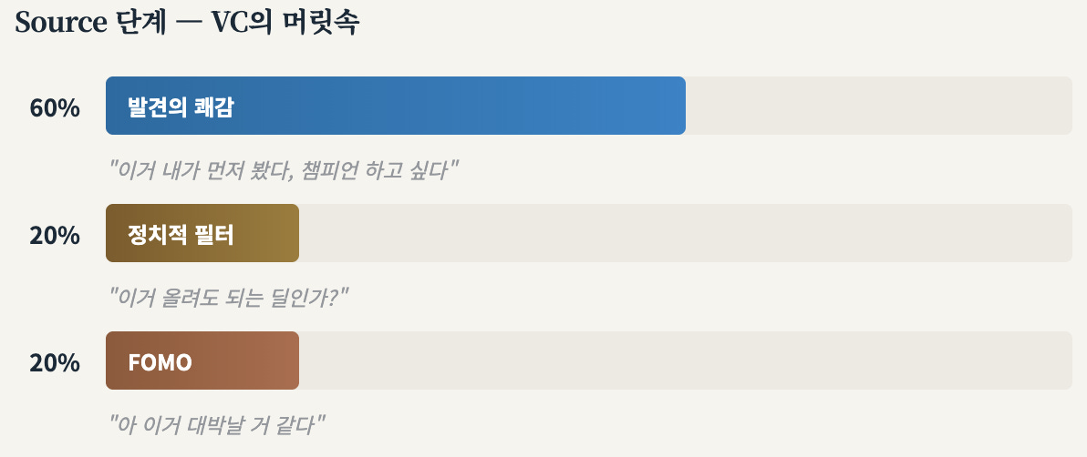Source 소싱에서는 2층의 방정식이 가장 날것으로 분출되는 단계입니다. “내가 먼저 봤다”는 성취감, 이 딜의 챔피언이 되고 싶다는 욕망, 큰 돈을 벌수있을 딜이라는 직관. 남들이 보지 못한 곳에서 기회를 포착했다는 순수한 흥분이 지배하는 단계입니다.