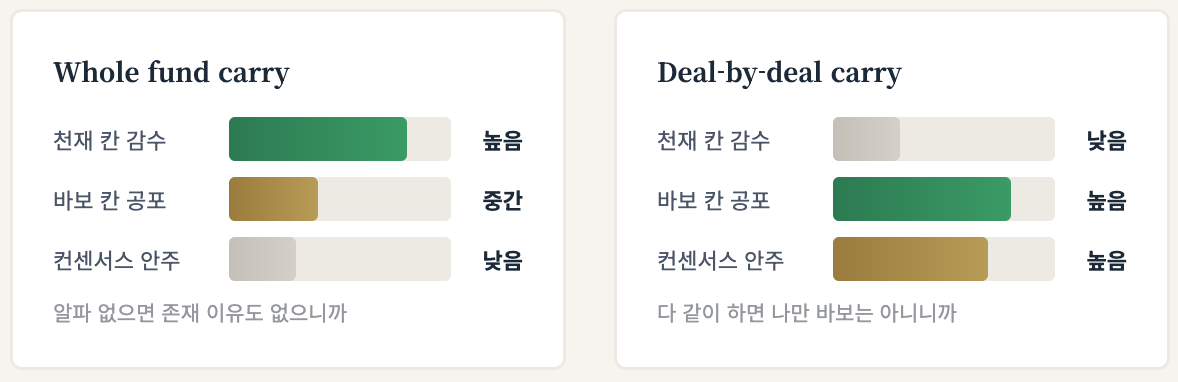Whole fund carry → 펀드 전체 최적화, 동료 딜도 내 이익, 팀 협업 인센티브