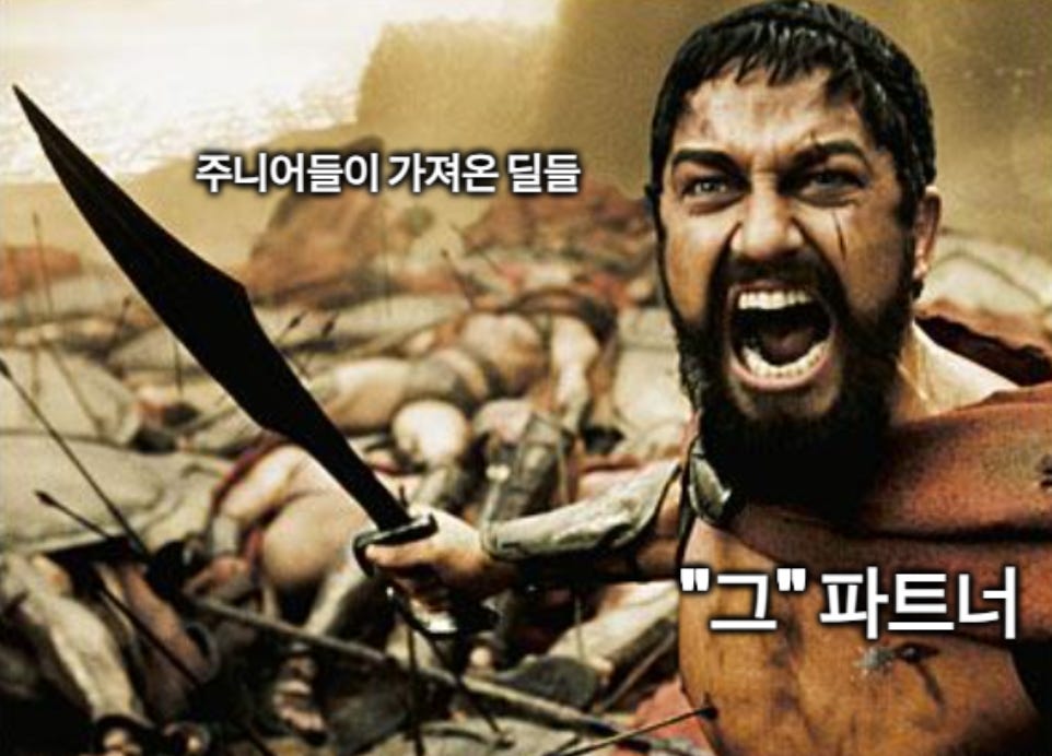 그리고 탑다운과 바텀업의 차이를 이해해야 합니다. 파트너가 관심을 갖고 “이거 한번 봐봐”라고 주니어에게 내려보내면, 그 주니어는 파트너의 관심이라는 후광을 가지고 딜을 검토합니다. 반대로 주니어를 먼저 만나서 밑에서 올라가는 경로는 피곤합니다. 주니어가 딜을 올렸을 때 파트너가 관계에 따라 반감이 생겨서 아예 딜을 못할수도 있고, 다른 파트너가 그 딜에 욕심을 내면서 챔피언 구조가 꼬일 수도 있거든요.