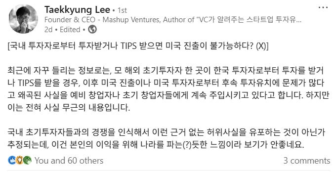 아래는 이택경 대표님께서 올려주신 링크드인 글과 거기에 제가 남긴 댓글입니다.
