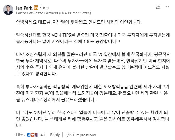 결론부터 말씀드리면, "한국 VC의 투자를 받는다고 해서 미국 진출이나 미국 VC의 후속 투자가 불가능하다"는 말은 사실이 아닙니다. 세계적으로 뛰어난 기술과 프로덕트를 가진 스타트업이 단지 한국에서 투자를 받았다는 이유만으로 미국 시장에서 외면받을 리는 없겠죠. 다만, 제가 댓글에서 언급했듯이 특정 조건에서는 불리한 상황이 발생할 수 있다는 점은 일부 사실이라고 생각합니다.