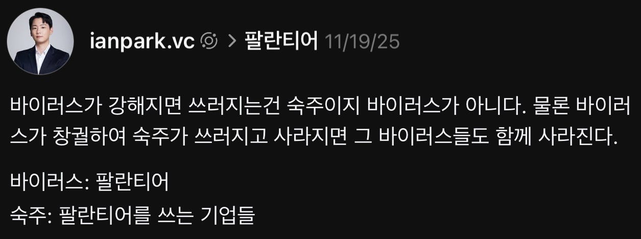 아직까지도 크게 생각이 바뀌지않은 팔란티어에 대한 글인데, 스레드에 조금 더 발전된 생각 관련해서 글을 남기긴 했습니다. 앞으로 어떻게 풀려갈지 함께 지켜보시죠 ㅎㅎㅎ
